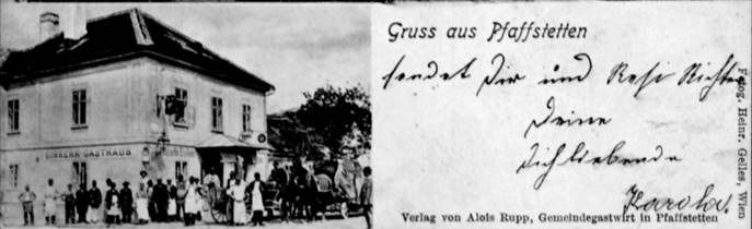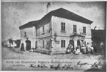 Eine der ältesten Fotografien des Gemeindegasthauses ist auf einer Postkarte zu sehen, Alois Rupp hieß 1893 der Pächter des Einkehrgasthauses, er war aber auch Verleger dieser Postkarte.