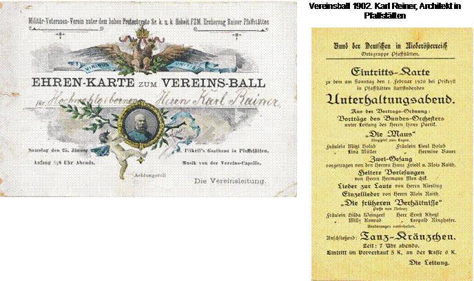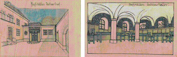 Der in Pfaffstätten ansässige Architekt Karl Reiner entwirft einige Umbaupläne. Eine sehr interessante Ansichtskarte, welche Karl Reiner 1924 (mit) gestaltet hat, sowie seine Entwürfe von Hof und Ritterstuben (Rathauskeller) zeugen davon.