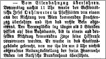 Am 11.März um ½ 12 abends saßen mehrere in Pfaffstätten einquartierte Dragoner im Lokal, als einige einheimische Burschen die ihre Einberufung feierten, eintraten und schnell ein Streit entstand. Dieser artete schnell in eine Massenschlägerei aus: die Burschen gingen mit Degen bzw. Messer und Flaschen aufeinander los. Man holte zwar schnell einen kommandierenden Offizier herbei, aber es war schon passiert: es gab mehrere Schwerverletzte, wobei ein Dragoner bald darauf seinen Verletzungen erlag.