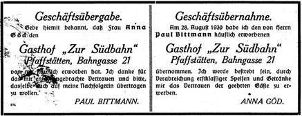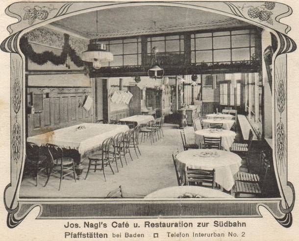 1904 kaufte Josef Nagl das Lokal Zur Einöde. 1913 übernahm er dann das Cafe Zur Südbahn in der Bahngasse in Pfaffstätten.