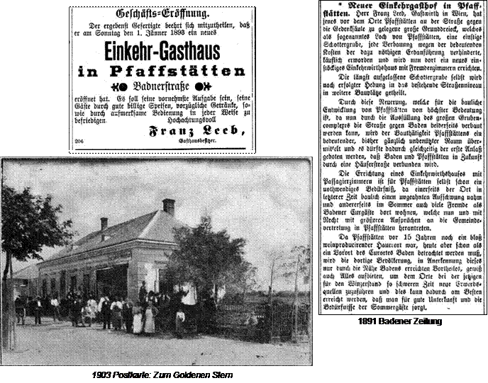 Das Gemeindegasthaus lag günstig an der Durchzugsstraße von Wien nach Baden, Fuhrwerker und Reisende frequentierten das Lokal. Um 1900 begann das Automobil seinen Siegeszug, zunächst noch recht angefeindet (Steinwürfe sind dokumentiert). In Baden gab es sogar eine Automobilfabrik, die „Automobilfabrik Leesdorf“.