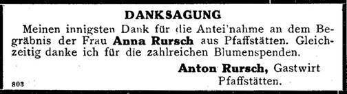 Anton Rursch, ein Gastwirt aus WienFloridsdorf, heiratet 1925 die Anna Fuchs aus Pfaffstätten. 1930 führt er ein Gasthaus Zum Bahnhof in Baden, Hötzendorfplatz 13 (ehemaliges Arbeiterheim).1935 hilft er kurz im Gasthaus Kopp (Badenerstr. 2) aus. Im selben Jahr erhält er die Konzession für ein Schankgewerbe auf Einöde 2 (Restauration Zur Einöde).
