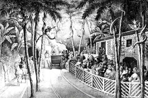 Hier wurden grottenbahnartig die großen Kontinente präsentiert, für den Transport sorgte eine unterirdische Pferdeeisenbahn. Musik, Tanz, akrobatische Darstellungen und kulinarische Genüsse wurden geboten, es gab auch ProjektionsVorstellungen (Nebelbilder) nach Art der Laterna magica.