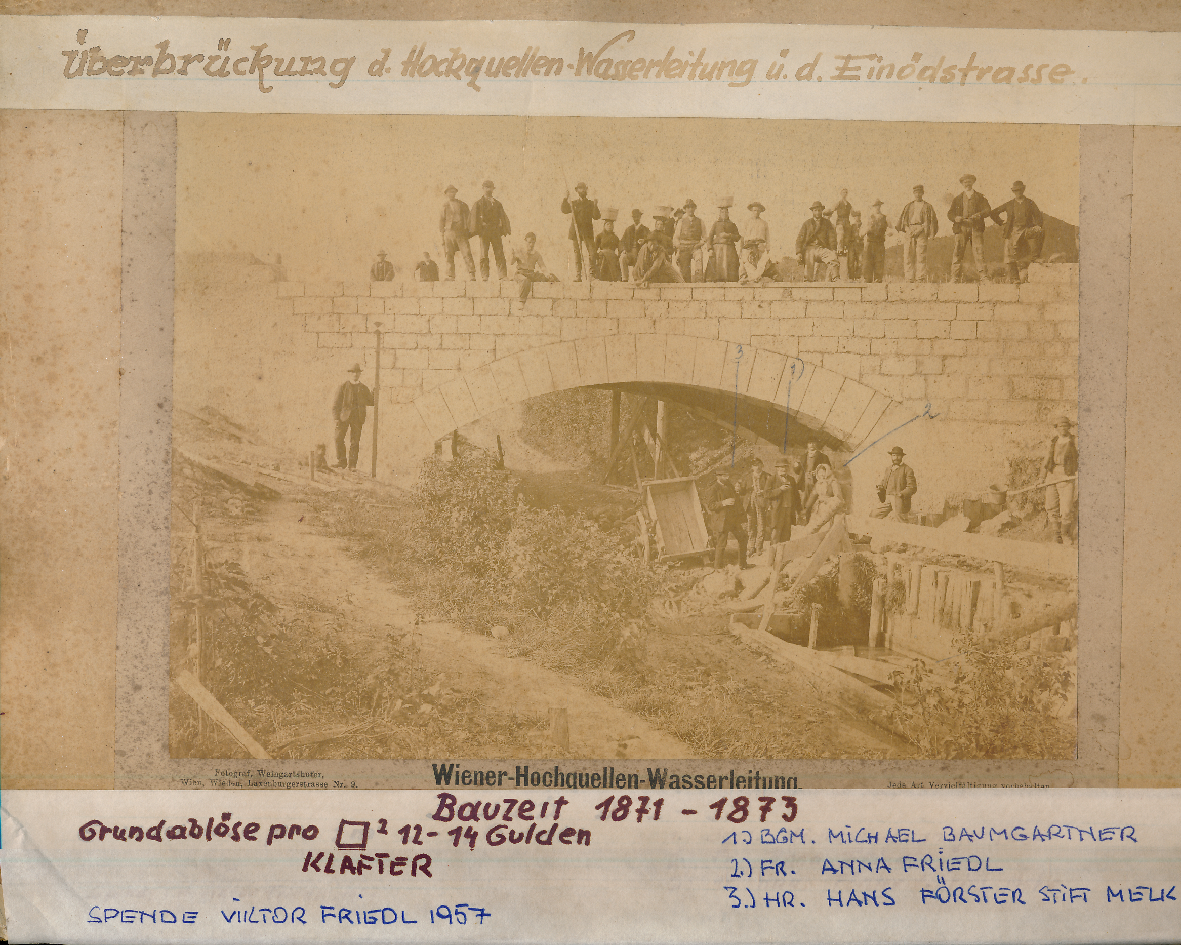 Das bisher älteste bekannet altes Foto aus Pfaffstätten stammt aus den Jahren 1871-1873. Es zeigt eine beschriftete Postkart des Baus des Aquädukts in der Einöde. Diese Postkarten sind heute begehrte Sammlerstücke.