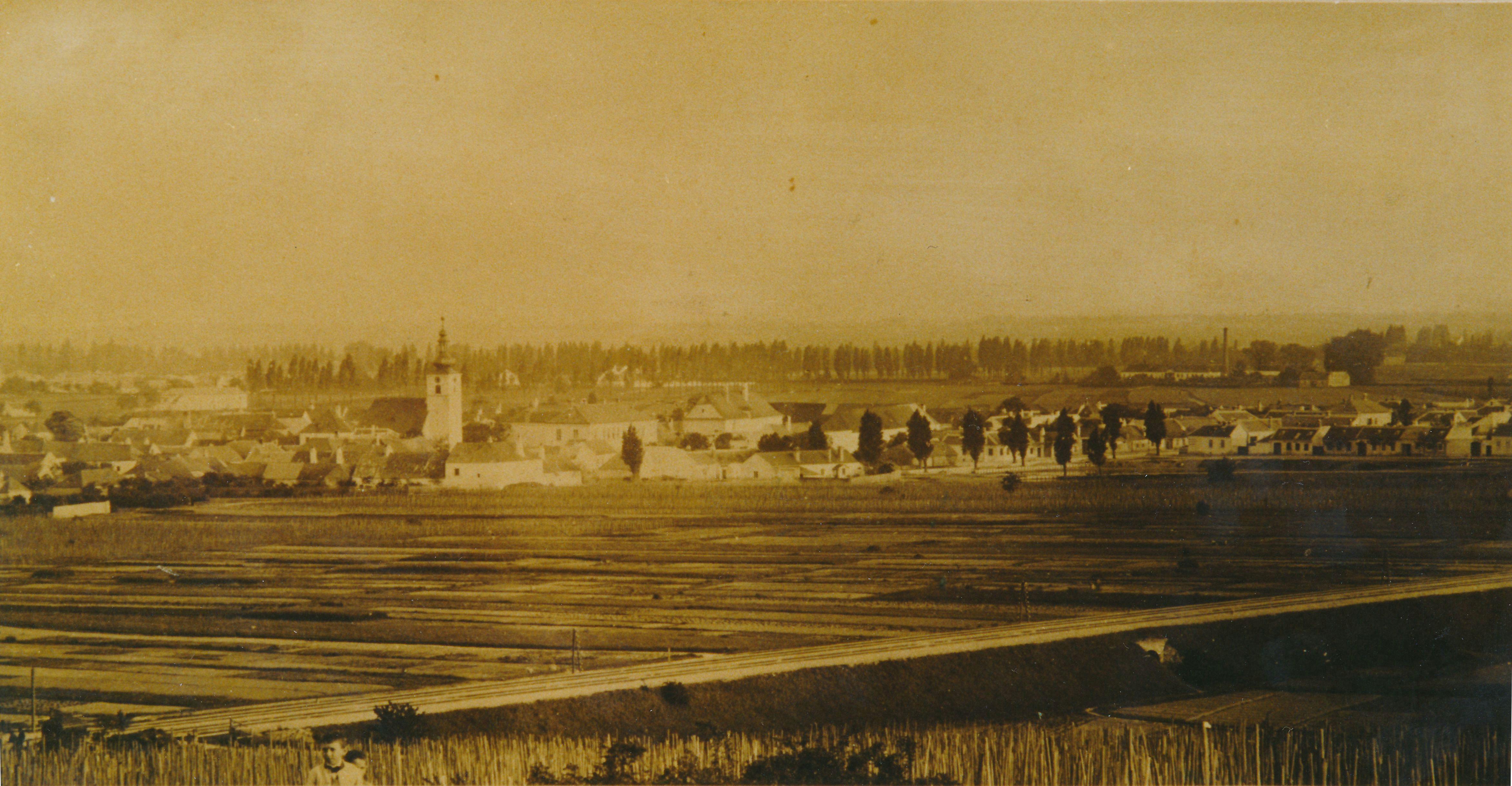 Diese Fotografie, beschriftet mit "Pfaffstätten ca. 1890" zeigt Pfaffstätten vom Nordwesten. Im Vordergrund sieht man die Südbahngleise, dahinter die Spitzendorfergründe.