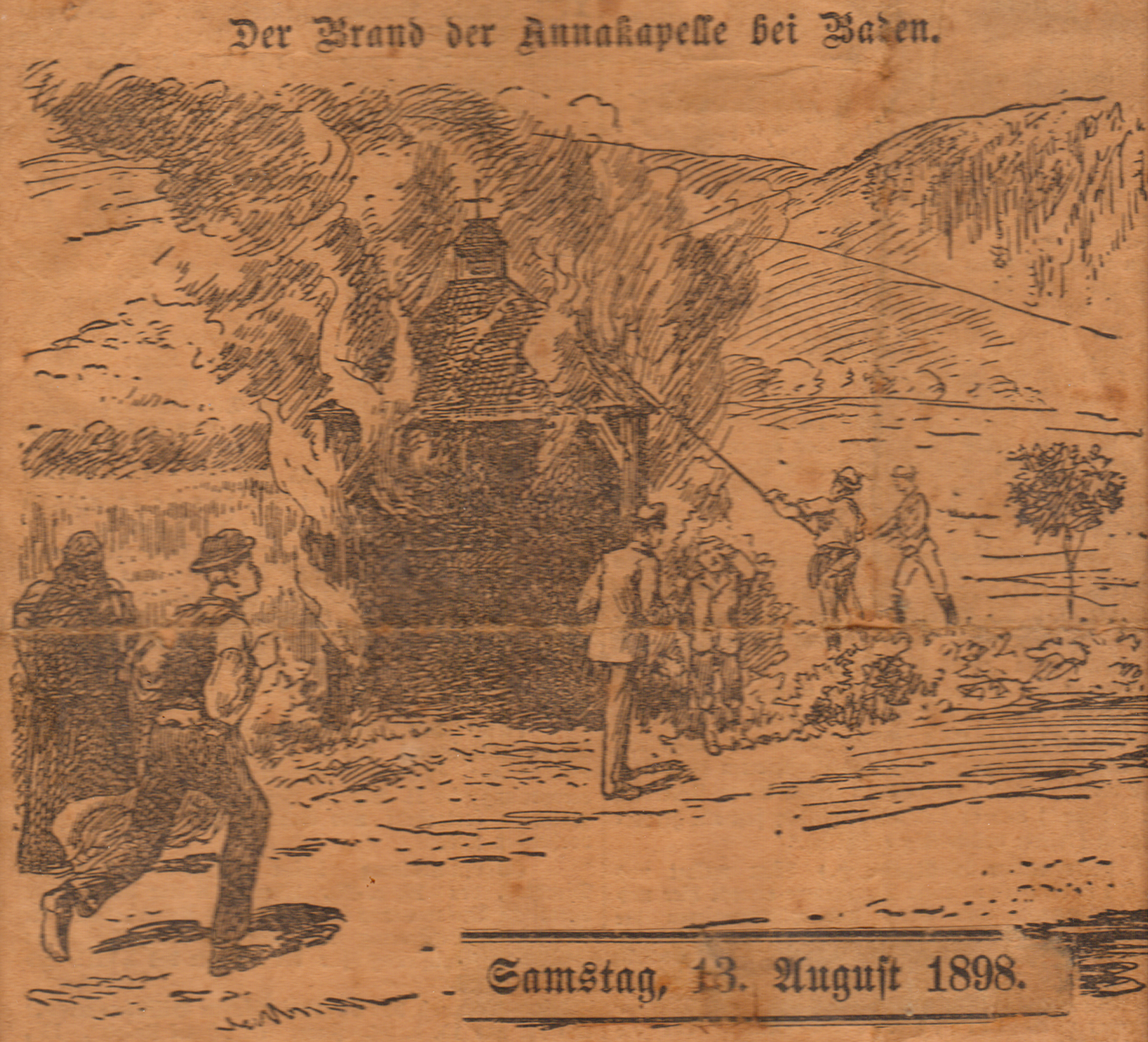 Die Badener Zeitung berichtet am Samstag den 13.August: "Wir haben vor einigen Tagen berichtet, daß die Annakapelle, die auf dem Wege von Pfaffstätten nach der Einöd gelegen ist, gänzlich niederbrannte. Die Annakapelle, auch Einödkapelle genannt, ist zu Anfang des Jahrhunderts errichtet worden und war ein beliebter Wallfahrtsort. Ein Knabe hatte die Katastrophe herbeigeführt. Das ewige Licht war verlöscht und das Kind wollte es wieder anzünden. Es hantierte dabei ungeschickt, bis die Papierrosen-Verzierung Feuer fingen. Das Altarzeug stand im Nu in Flammen und die Annakapelle war in einer Stunde niedergebrannt. Vorstehend bringen wir das Bild der Kapelle nach einer uns von Herrn Ignaz Kerschbaum in Baden zur Verfügung gestellten Skizze."